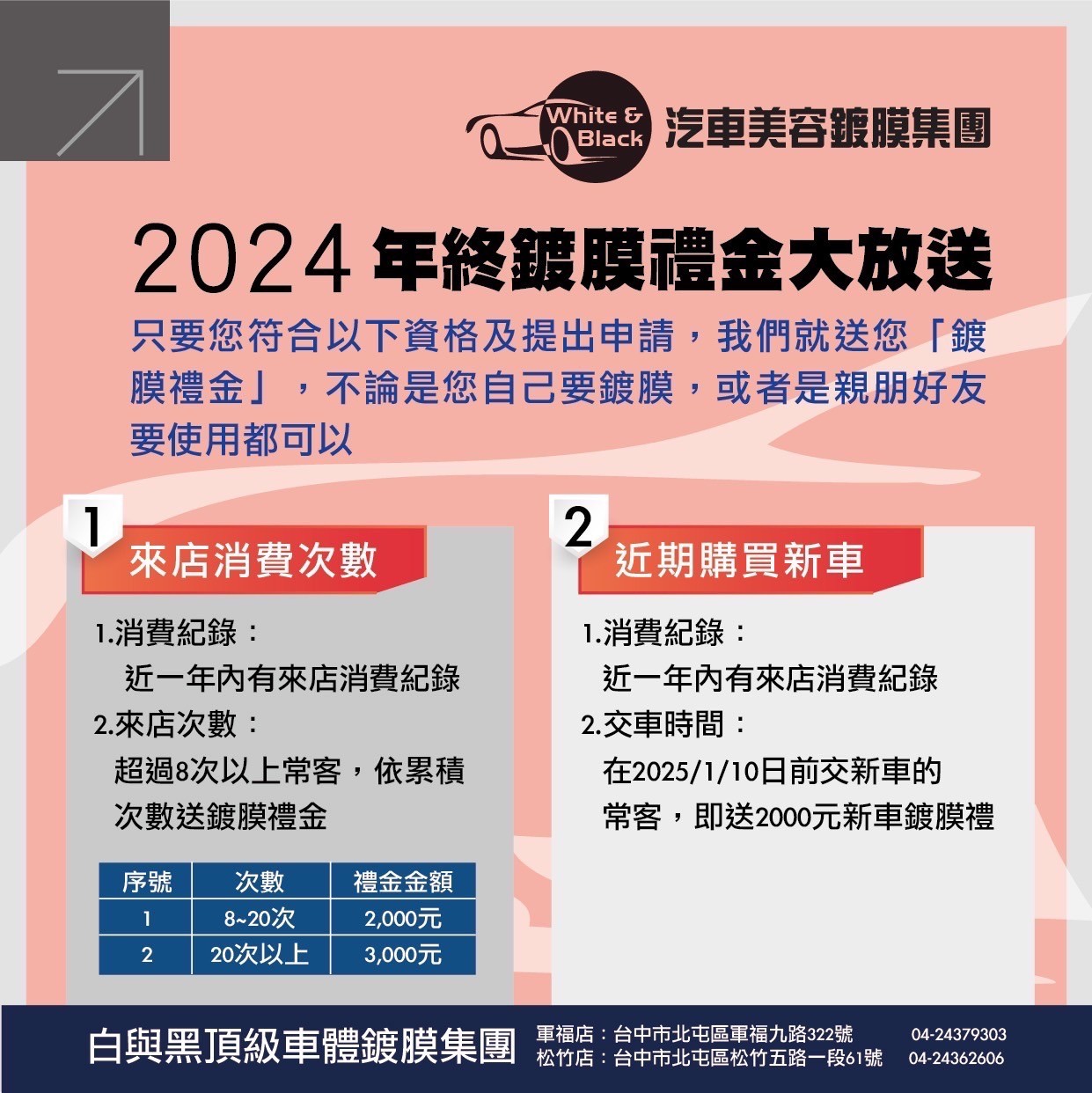 2024年終鍍膜禮金大放送 只要您符合以下資格及提出申請,我們就送您「鍍 膜禮金」,不論是您自己要鍍膜,或...